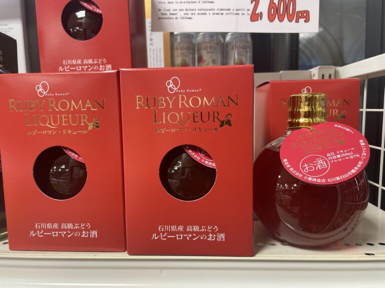 今月の人気商品(お酒) 大粒で鮮やかなルビー色、糖度18度以上の濃厚な甘みを持つ石川県産の高級ぶどう「ルビーロマン」を使用した贅沢なお酒です。 商品価格 350ml 2600円 -